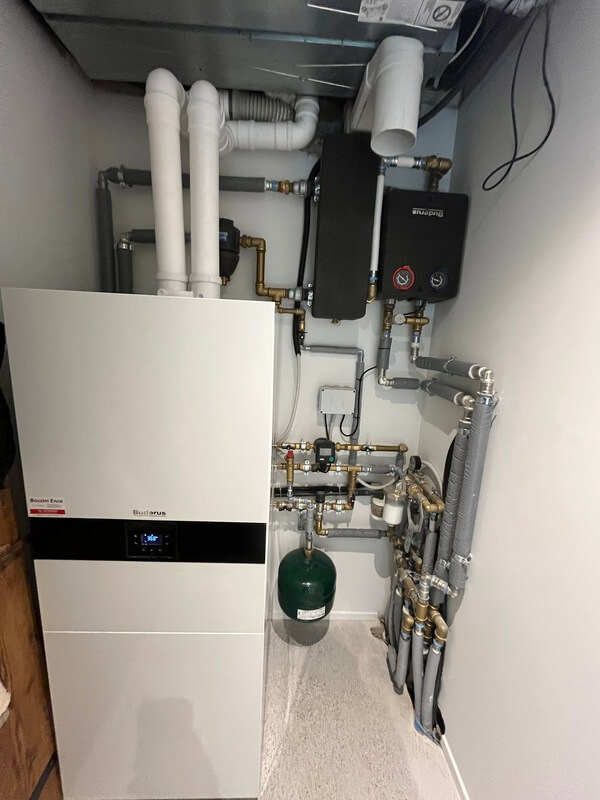 Centrale termica con caldaia a condensazione a basamento con accumulo acqua sanitaria.