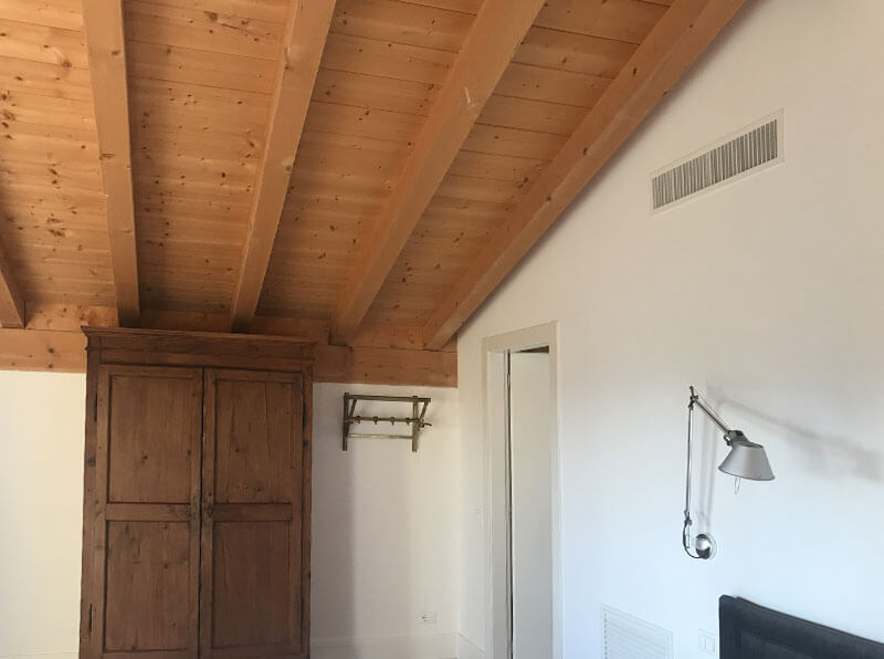 Realizzazione di impianto con pompa di calore aria-aria per riscaldamento/raffrescamento di un agriturismo. La pompa di calore aria-aria ha unità di diffusione a pavimento integrate in una parete in cartongesso.