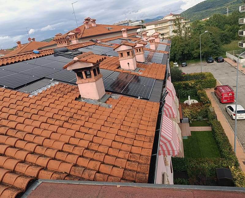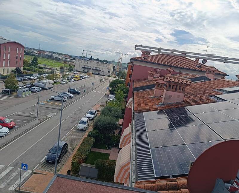 Impianto fotovoltaico integrato con 60 moduli Viessmann per totali 27 kW di picco e due Inverter a servizio di un condominio di quattro scale in cui è stata costituito un gruppo di autoconsumo collettivo con 35 consumatori collegati virtualmente all’impianto per utilizzarne la produzione.