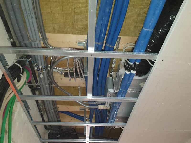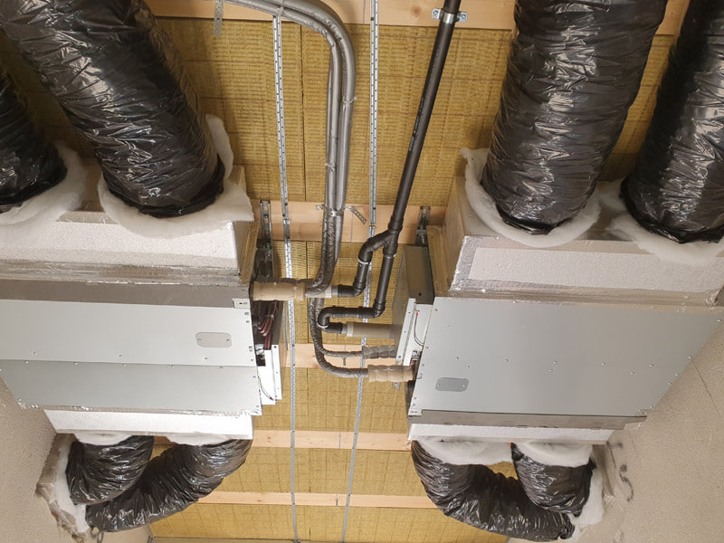 Impianto di riscaldamento e raffrescamento radiante a soffitto con pompa di calore e unità canalizzate ed impianto di ventilazione meccanica controllata (VMC).