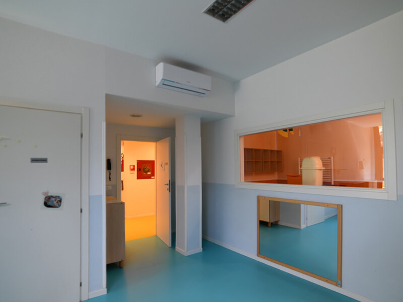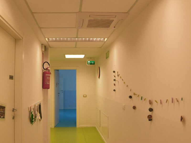 Impianto di raffrescamento e riscaldamento, con unità esterne con tecnologia VRF in pompa di calore a liquido refrigerante variabile collegate ad unità interne a soffitto, a parete e cassetta.