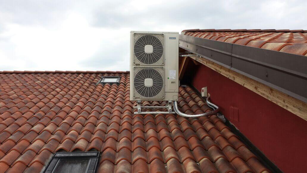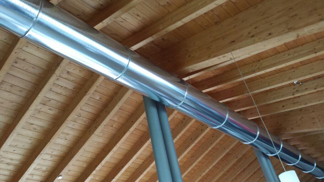 Impianto di riscaldamento-raffrescamento in una pizzeria con diffusione dell'aria tramite condotta microforata che permette una distribuzione omogenea dell'aria. Il calcolo preciso di portata e velocità d'aria dei ventilatori delle unità interne, unito al corretto dimensionamento e foratura dei canali, ha permesso di ottenere un flusso non avvertibile dai clienti.