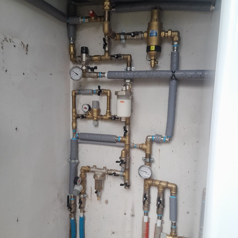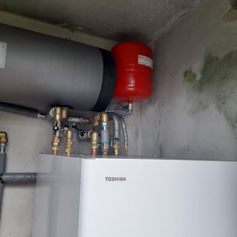 Pompa di calore Estia monoblocco per riscaldamento ed ACS. L'intervento è consistito nella sostituzione della vecchia caldaia potendo disporre di spazi molto ristretti.